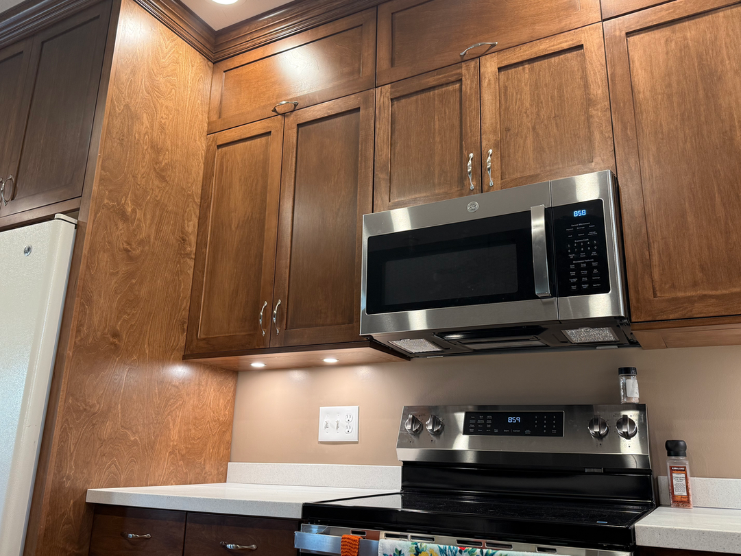This kitchen was highly customized with pullouts and a fully moveable kitchen island on wheels! Featuring shaker style doors, custom pullouts, and solid surface, this kitchen is functional and timeless.