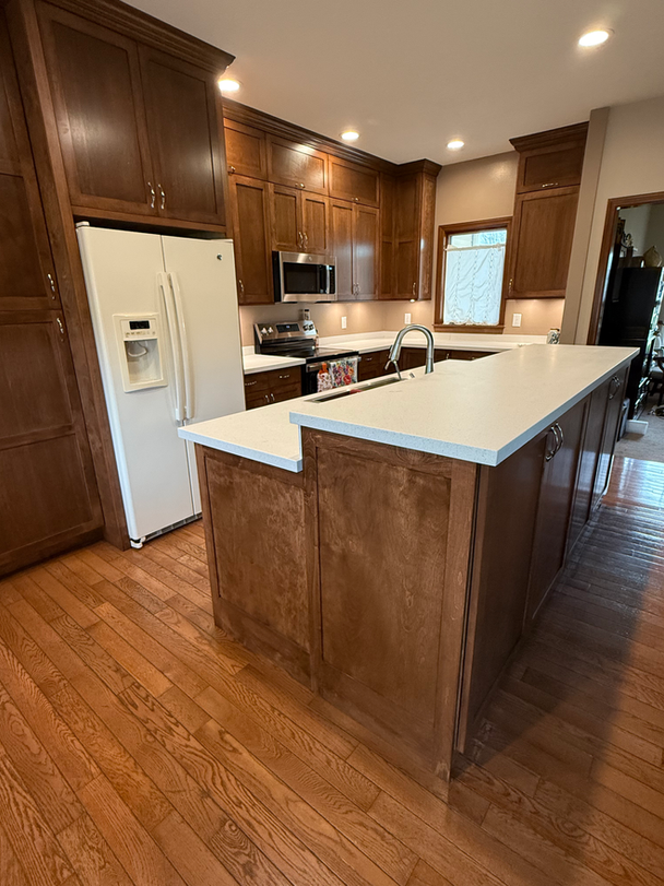 This kitchen was built from heritage lumber. Cherry trees from the family farm were milled and used to create this custom kitchen. Featuring solid surface, shaker style doors, and beautiful cherry in its natural finish, this kitchen will be enjoyed for generations.